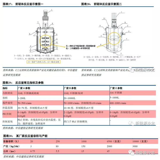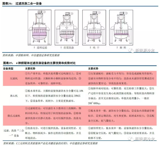 除生產工藝外,三元材料的性能和成本還與關鍵設備的選擇有關。前驅體的關鍵設備包括反應釜、過濾和洗滌設備、干燥設備等。