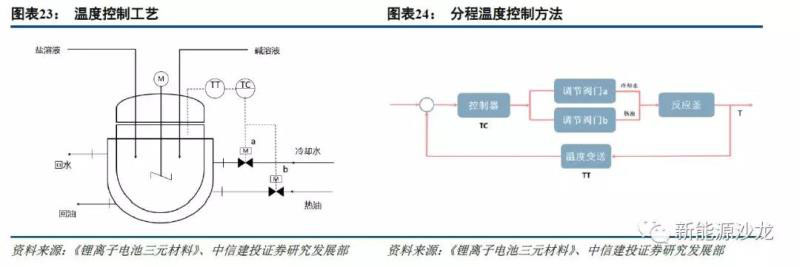 三元材料前驅體生產是鹽與堿在一定pH值及溫度下的共沉淀反應,pH值是該反應最重要的參數(shù),各階段pH控制波動范圍小于±0.05,pH值的穩(wěn)定又依賴于溫度的穩(wěn)定以及氨水濃度的穩(wěn)定;氨水濃度、攪拌速度以及溫度的波動也會對前驅體形貌、粒徑、元素配比等造成直接影響,幾種因素的穩(wěn)定與否對反應產物的性能有決定性的作用,因此生產過程中反應條件的控制精度可以體現(xiàn)各家企業(yè)技術水平。