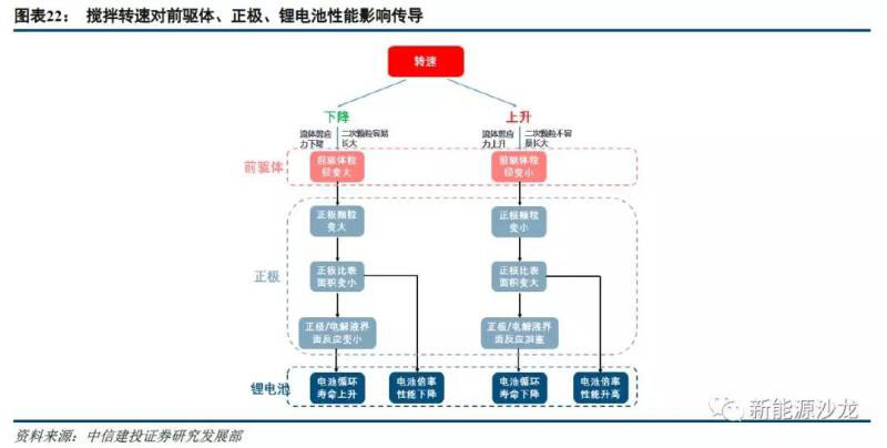 攪拌速度對前驅體、正極、鋰電池性能影響傳導主要通過影響顆粒形貌。攪拌速度過低會導致前驅體晶體生長過快,球形度變差,材料間空隙變多,從而導致前驅體比表面積過大;攪拌速度過高會導致前驅體團聚體中的一次顆粒過大,造成材料間空隙變多,從而導致前驅體比表面積過大。前驅體比表面過大,將導致正極振實、壓實密度下降,鋰電池能量密度下降,同時正極材料與電解液界面反應加劇,電池循環(huán)壽命下降;另一方面由于空隙變多,鋰離子傳輸通道變多,電池倍率性能提升。