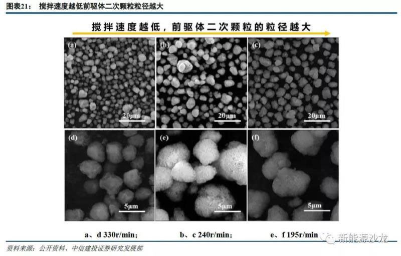 固含量:在前驅體反應過程中,前驅體漿料的固體質量和液體質量的比值。目前大部分廠家反應釜中前驅體的固含量在5%~10%左右。不同的固含量對產品性能行有一定影響,適當提高固含量能優(yōu)化產品形貌、提高產品的振實密度。如圖表15所示,相比較于10%固含量的情況,20%固含量下產品的形貌較為規(guī)整,二次顆粒表面較為致密。