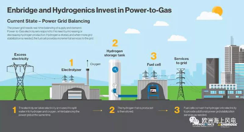 該模式基于E-bridge一個名為“Power to Gas”的研究項目,即通過電力制氫制氧的方式來平衡電網(wǎng)中電力供需關(guān)系。簡單來說就是氫儲能來調(diào)節(jié)電力峰谷,是儲能技術(shù)的另一個技術(shù)路線。