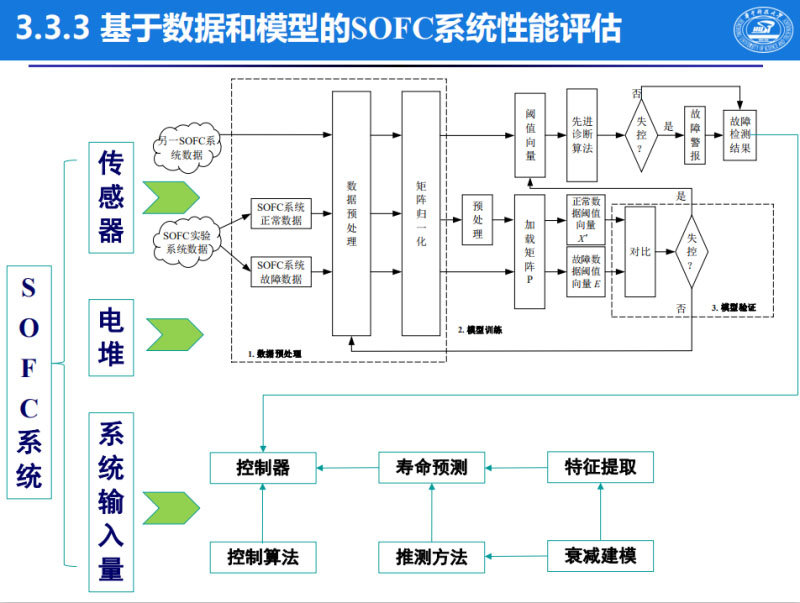 具體怎么分析,怎么評(píng)估和做出相應(yīng)的診斷?下面我介紹一下這一塊所開展的工作。對(duì)一個(gè)系統(tǒng)級(jí)固體氧化物燃料電池發(fā)電系統(tǒng),這是它的結(jié)構(gòu)示意圖,一般分高溫區(qū)和低溫區(qū)。高溫區(qū)包括電堆、燃燒室、重整、換熱,低溫區(qū)一般包括有電控單元、傳感、儀表和風(fēng)機(jī)等。低溫區(qū)故障相對(duì)容易處理。高溫區(qū)處于600℃以上的環(huán)境,每一部件性能稍有損傷都會(huì)影響到整個(gè)系統(tǒng)品質(zhì)。針對(duì)高溫區(qū)部件具體所面臨的各類的問題,比如性能是怎么衰減的、怎么規(guī)避、怎么延緩、怎么控制?我們主要圍繞了四個(gè)關(guān)鍵性容易發(fā)生故障的部件單元進(jìn)行分析——電堆、重整、換熱和燃燒?;诖罅肯到y(tǒng)發(fā)電測(cè)試分析,在上述冷區(qū)與熱區(qū)這幾個(gè)關(guān)鍵部分,針對(duì)其從正常工作到異常工作性能逐步衰減、發(fā)生故障的全過程,通過機(jī)理模型分析和數(shù)據(jù)驅(qū)動(dòng)建立了含各部件特性演變的模型。把正常、異常乃至故障的數(shù)據(jù)盡可能地和我們所搭建的模型去匹配,結(jié)果顯示模型分析預(yù)測(cè)結(jié)果與所建立的樣本數(shù)據(jù)還是比較接近的?;谠撓盗谢容^高的模型,才得以開展下面的評(píng)估診斷和控制。