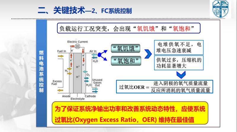 第二個關(guān)鍵技術(shù),就是燃料電池系統(tǒng)控制。大家知道,豐田的大巴和乘用車,混合動力系統(tǒng)拓?fù)浜涂刂贫际遣灰粯拥?,就是因?yàn)閮烧吖r不一樣。軌道交通的工況,完全不同于汽車,在數(shù)秒內(nèi)會出現(xiàn)上千安的電流波動,即使有儲能來跟蹤負(fù)荷變化,但母線電壓仍然會出現(xiàn)劇烈波動,對燃料電池的影響是非常大的。因此,軌道交通燃料電池系統(tǒng)控制,非常重要。對此,我們有十年左右的研究。燃料電池系統(tǒng)控制,主要關(guān)注四個控制目標(biāo),那就是滿足負(fù)載功率的需求、提高效率、延長壽命,在許可的情況下盡量提高它的響應(yīng)速度。影響這四大目標(biāo)的影響因素,包括溫度、壓力、濕度、還有氣體和汽液的動態(tài)時空分布。結(jié)合軌道交通工況,怎么樣開展燃料系統(tǒng)的控制,使得上面的多物理場多時空尺度的均衡分布,滿足四大目標(biāo)的實(shí)現(xiàn),這是我們關(guān)心的問題。