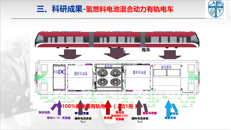 下面匯報一下我們的研究成果。我們主要針對燃料電池、動力電池在軌道交通方面的工作。我們的項(xiàng)目,從國家到部級到省級,都是燃料電池和軌道交通方面相關(guān)的。這是2013年我們團(tuán)隊(duì)研制的國內(nèi)首輛燃料電池電動調(diào)車機(jī)車,采用的是地鐵實(shí)際在用的調(diào)車。這個就是2016年4月份做的一個燃料電池混合動力的有軌電車。上面這是樣車研制時候的樣子?,F(xiàn)在這個車放在唐山,就是下面這個圖,刷成紅色了,想作為唐山的工業(yè)旅游線路的交通工具?,F(xiàn)在這個車準(zhǔn)備再開展為期兩年的運(yùn)行。一直在做這種試驗(yàn)測試工作。這是當(dāng)時我們這個車儲能還有燃料電池系統(tǒng)的布局。這是當(dāng)時這個車出來的時候的視頻。