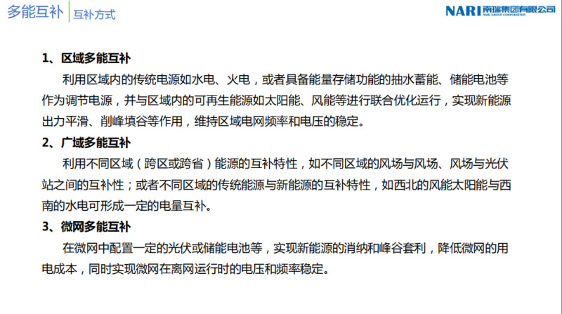 同時我們現(xiàn)在國家的三棄問題比較突出,通過配置這些具有電能存儲能力的調(diào)節(jié)電源也可以有效解決這個問題。第二個就是介紹一些多能互補的方式,我個人認(rèn)為現(xiàn)在主要有三種互補方式,就是主要利用區(qū)域內(nèi)傳統(tǒng)的水電能源,或者儲能電池跟可再生能源做一些運行來平滑新能源的出力,主要就是應(yīng)用一些跨區(qū)或者跨省的能源之間的互補的特性。比如不同區(qū)域的風(fēng)電跟光伏有一個互補的特性,不同區(qū)域的比如說我們這個風(fēng)能還有太陽能比較分子的西北地區(qū)還有我們這個水電能源比較突出的西南地區(qū)的能源之間也可以形成一定的電量互補。