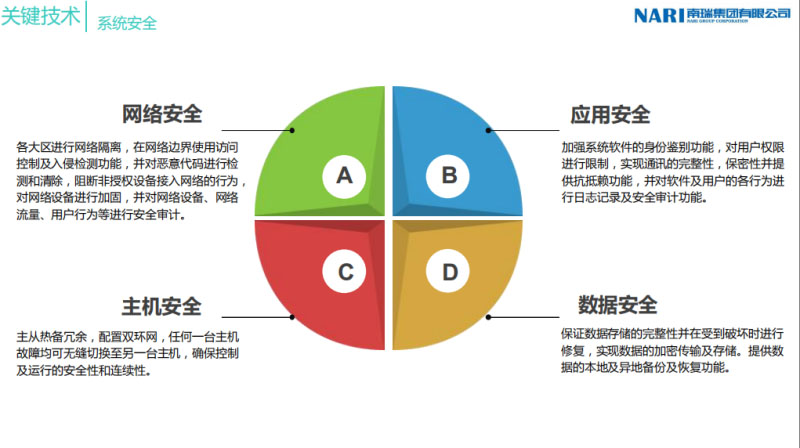 第四個是系統(tǒng)安全,在我們國家這個像烏克蘭或者就是委內(nèi)瑞拉的并路中間,導(dǎo)致的電網(wǎng)事故不允許發(fā)生的。在系統(tǒng)安全方面采用的四方面的技術(shù)手段,第一個是網(wǎng)絡(luò)安全方面,我們在網(wǎng)絡(luò)邊界使用這個訪問控制還有中心檢測功能,對于惡意代碼檢測清除,阻斷非法入侵。第二個在應(yīng)用安全方面,加強這個系統(tǒng)軟件的身份鑒別對于用戶的一些操作權(quán)限進行了一些限制,同時實現(xiàn)通訊的完整性還有保密性。第三個主機的安全,都是采用雙網(wǎng)配置,通過這些配置主機無縫切換這樣確保實時控制系統(tǒng)的連續(xù)性和可靠性。數(shù)據(jù)安全方面,我們保證數(shù)據(jù)存儲的完整性和可恢復(fù)性數(shù)據(jù)發(fā)生破壞被破壞,出現(xiàn)問題的時候,可以及時恢復(fù),這是數(shù)據(jù)安全。這個是我們對于數(shù)據(jù)安全方面采取的數(shù)據(jù)分區(qū),這個也是符合我們國家能源局的一個規(guī)定。在數(shù)據(jù)采集區(qū),存儲處理區(qū)和發(fā)布區(qū)采用了軟件還有硬件的隔離措施,同時對于在數(shù)據(jù)傳出過程當(dāng)中有加密方法。