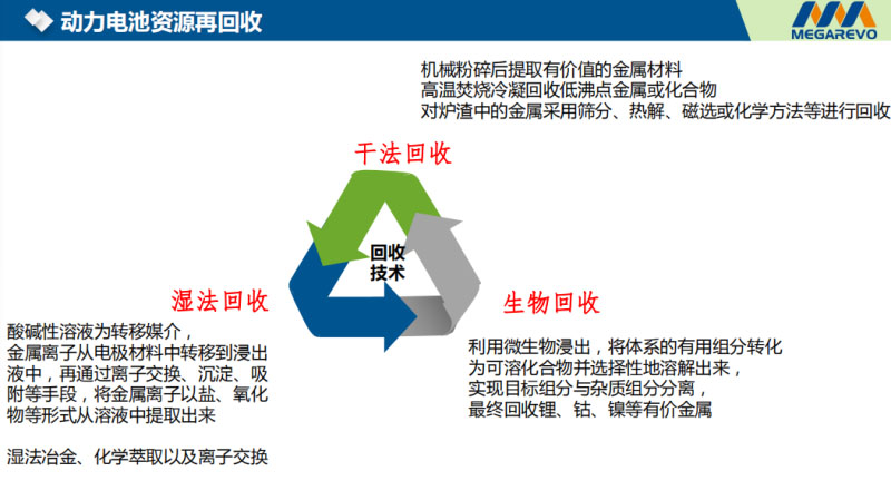 簡單講一下,這是材料再回收的幾種方法,現(xiàn)在市面上也有的,一個(gè)是干法的、一個(gè)是濕法的。干法的就是把電池機(jī)械性的粉碎了,把有用的金屬成份提煉出來。濕法就是用酸堿溶液為媒介,金屬離子從電極材料里面轉(zhuǎn)移到溶液里面,經(jīng)過離子的交換、沉淀、吸收等方式把金屬以鹽的氧化物的形式提取出來。生物質(zhì)的方式,就是用生物的方法把金屬從電極里面分離回收起來。