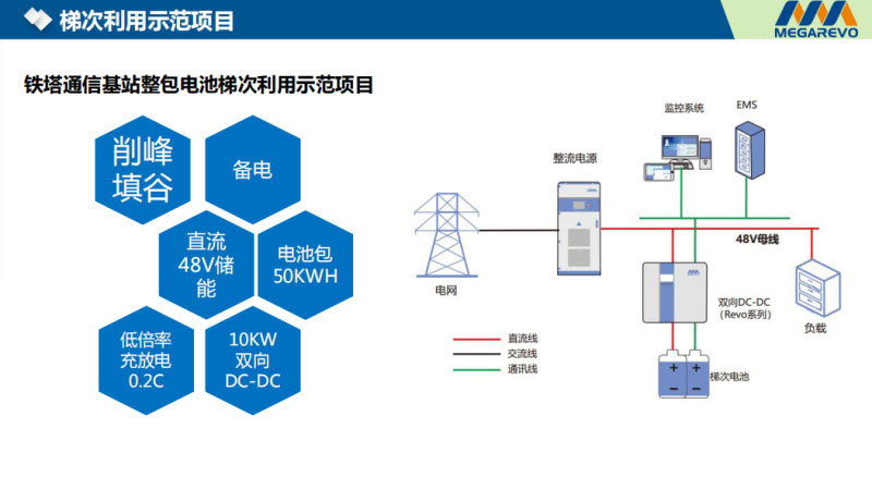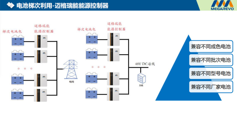 兩種應(yīng)用模式:第一種,梯次電池包,經(jīng)過邁格瑞能在能量控制器,若干個(gè)能量控制器,十個(gè)、幾十個(gè)能量控制器,在交流側(cè)并聯(lián)、在交流側(cè)并網(wǎng)。另外一種模式,梯次電池電池包經(jīng)過DC/DC的變換器,在48V的直流側(cè)48V母線上進(jìn)行應(yīng)用。這種應(yīng)用不管是直流側(cè)的還是交流側(cè)的應(yīng)用,可以兼容不同的成色的電池,這個(gè)電池剩余容量80%,那個(gè)電池剩余容量70%、60%,都可以在我的項(xiàng)目上進(jìn)行使用??梢约嫒莶煌蔚碾姵兀嗖顜啄?、相差一年、相差兩年的電池拿來,都可以直接在這個(gè)項(xiàng)目上進(jìn)行應(yīng)用。不同型號(hào)的電池、不同廠家的電池,都可以在我的項(xiàng)目上使用。對(duì)現(xiàn)實(shí)意義來講是非常巨大的,因?yàn)樘荽坞姵貋碓醋畲蟮膹?fù)雜性就在于它的來源非常不確定性,成色不同、批次不同、型號(hào)不同,廠家不同,應(yīng)用這種方案就可以解決這些問題。