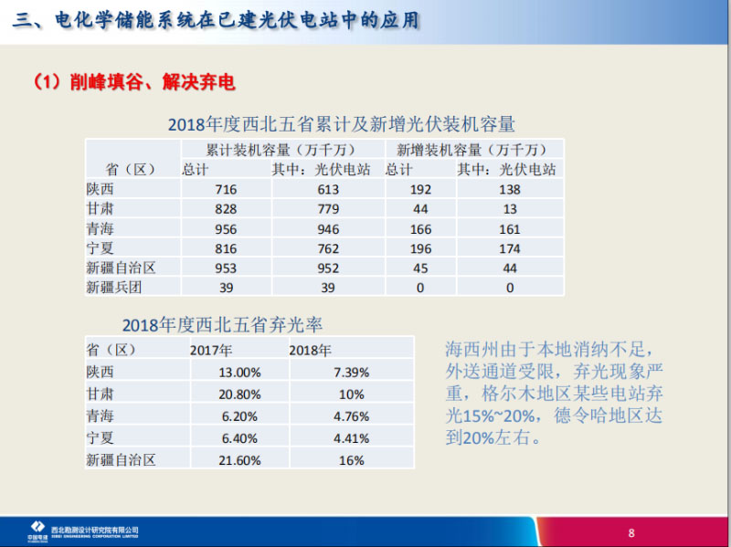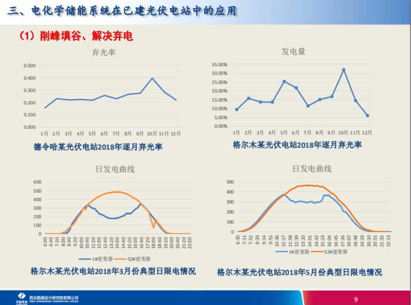 下面介紹一下在電化學(xué)儲(chǔ)能系統(tǒng)在我們已建光伏電站中應(yīng)用的一些可行性,幾個(gè)應(yīng)用場(chǎng)景。1,削峰填谷,解決棄電。我們都知道西北五省是我們最早規(guī)?;_發(fā)光伏電站的廠區(qū),對(duì)于早期建設(shè)的光伏電站來說投資成本比較高、電價(jià)比較高,如果在比較嚴(yán)重的棄光條件下,電站的收益是難以保證的。以青海為例,雖然全省2017年、2018連棄光率從6.2%下降到了4.76,但是在局部地區(qū),比如海西州,由于本地消納不足、外地輸送受阻是比較嚴(yán)重的,據(jù)我們了解格爾木某些電站去年棄光達(dá)到了15—20%,而德爾哈地區(qū)甚至超過了20%。這是德令哈、格爾木在2018年全年逐月的棄光率,圖里面可以看得出來,棄光是比較嚴(yán)重的,基本上15%,10%以上,甚至到了30%。