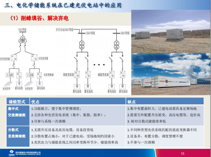 在已建的光伏電站中,增設(shè)儲(chǔ)能系統(tǒng),我們主要有兩種方案,一種是集中式布置,一種是分散式布置。我們上面這兩張圖可以看出來,對(duì)于分散式布置來說,就是將儲(chǔ)能系統(tǒng)分散式布置在我們各個(gè)光伏子陣中,蓄電池通過直流變換器之后直接接入光伏逆變器的直流側(cè),實(shí)現(xiàn)直流側(cè)的儲(chǔ)能。而集中式就是,儲(chǔ)能電池是經(jīng)過儲(chǔ)能變流器以后,再經(jīng)升壓變壓器升壓之后接到我們光伏電站的升壓站或者開關(guān)站的中壓母線上。這兩種儲(chǔ)能方式也各有優(yōu)缺點(diǎn)的,集中式儲(chǔ)能,由于儲(chǔ)能系統(tǒng)和光伏發(fā)電系統(tǒng)是相互比較獨(dú)立的,所以比較便于集中管理調(diào)度,而不受光伏發(fā)電系統(tǒng)逆變器選型的限制的。集中式布置,還可以參與系統(tǒng)的一次調(diào)頻。分散式直流儲(chǔ)能,由于不需要經(jīng)過升壓變壓器以及高壓電纜的,所以設(shè)備投資相對(duì)低一些,而且由于分散式儲(chǔ)能是布置在每個(gè)子方陣中的,容量比較小,對(duì)于已建光伏電站可以布置在原有的逆變器室附近,不受場(chǎng)地制約。另外,由于光伏出力和儲(chǔ)能系統(tǒng)之間直流變換功率環(huán)節(jié)是比較小的,所以儲(chǔ)能系統(tǒng)效率相對(duì)要高一些。集中式交流儲(chǔ)能相對(duì)而言缺點(diǎn)就是,要集中布置,對(duì)于已建光伏電站來說可能要受場(chǎng)地的限制,它的設(shè)備投資可能相對(duì)會(huì)高一些。相對(duì)于分散式儲(chǔ)能來說,因?yàn)橐嘟?jīng)歷一級(jí)逆變和升壓的環(huán)節(jié),系統(tǒng)效率相對(duì)低一些。而分散式儲(chǔ)能,由于它是在直流側(cè)來儲(chǔ)能,就要跟原有的光伏逆變器進(jìn)行匹配,所以對(duì)直流變換器的要求比較多一些。設(shè)備布置比較分散,設(shè)備數(shù)量比較多,調(diào)度管理是不方便的。將來參與一次調(diào)頻的控制策略是比較復(fù)雜的,所以也是不建議它作為一次調(diào)頻系統(tǒng)來使用。