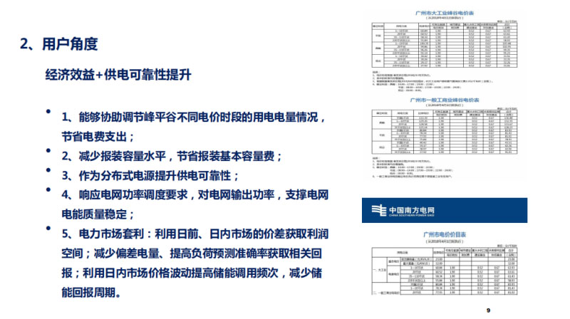 從用戶的角度,用戶的角度也是應(yīng)用場(chǎng)景比較成熟的,目前主要是利用峰谷電價(jià)還有減少容量包裝費(fèi),這兩個(gè)作為一個(gè)商業(yè)模式,后面如果隨著電力市場(chǎng)的開(kāi)放,隨著新能源分布式電源的增加,用戶側(cè)的場(chǎng)景可能也會(huì)發(fā)生一些變化。其實(shí)現(xiàn)在有一種說(shuō)法,如果光利用峰谷電價(jià)套利,可能商業(yè)風(fēng)險(xiǎn)未來(lái)可能比較大,尤其是在現(xiàn)貨市場(chǎng)開(kāi)放之后。