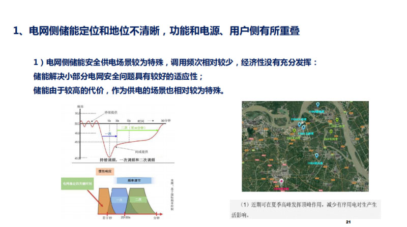 目前我們電源側(cè)和用戶側(cè)商業(yè)模式是比較成熟的,就是說(shuō)不管是電池選擇來(lái)說(shuō)、運(yùn)用場(chǎng)景來(lái)說(shuō),還有怎么投資回收來(lái)說(shuō),都是比較成熟的,一個(gè)是定位比較清晰,我要怎么做,回收模式我怎么把錢收回來(lái),都是比較清楚的,我們電源側(cè)儲(chǔ)能目前存在幾個(gè)問(wèn)題,一個(gè)是定位和定位不清晰,功能和電源用戶側(cè)有所重疊,一個(gè)是我們電網(wǎng)側(cè)儲(chǔ)能安全供電場(chǎng)景相對(duì)比較特殊,但是容量比較大,調(diào)用的頻次比較少,僅從安全性原因來(lái)說(shuō),調(diào)用頻次比較少,因?yàn)槟闶亲鳛殡娋W(wǎng)的安全性手段,有可能一年都發(fā)生不了一次,經(jīng)濟(jì)性就沒(méi)有充分發(fā)揮,儲(chǔ)能解決小部分電網(wǎng)安全問(wèn)題可能具有比較好的適應(yīng)性,但是它作為一個(gè)較高的代價(jià),如果僅作為一個(gè)供電削峰來(lái)說(shuō),其實(shí)代價(jià)也比較大,供電的場(chǎng)景也是較為特殊的,好比江蘇鎮(zhèn)江這么一個(gè)場(chǎng)景,如果找第二個(gè)這么一個(gè)場(chǎng)景,其實(shí)相當(dāng)難找。