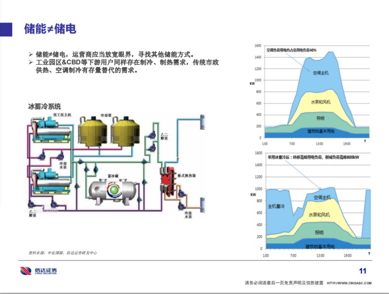 從這個(gè)角度來說,所以我們覺得說儲(chǔ)能的這個(gè)行業(yè)其實(shí)對(duì)自身有一個(gè)比較好的定位下我們覺得說其實(shí)如果是從運(yùn)營(yíng)商的角度來說,其實(shí)它應(yīng)該是做服務(wù),綜合能源服務(wù)其實(shí)是儲(chǔ)能發(fā)展的一個(gè)終極目標(biāo)。為什么這么說呢?因?yàn)槲矣X得大家應(yīng)該不應(yīng)該把目光局限在儲(chǔ)電上面,綜合能源服務(wù)一個(gè)是在觸電本身的領(lǐng)域下面要做更深入細(xì)致的一些工作,另外,它不應(yīng)該僅僅局限于儲(chǔ)電,比方說像冷熱這種形式也應(yīng)該考慮在內(nèi)的,最簡(jiǎn)單來說,儲(chǔ)能不代表是儲(chǔ)電,我覺得身為一個(gè)儲(chǔ)能按的運(yùn)營(yíng)商思路要打開,尋找其他儲(chǔ)能方式。比如在大的工業(yè)園區(qū)或者CBD的園區(qū)內(nèi),對(duì)于下游的用戶其實(shí)是存在一個(gè)制冷、制熱的需求。傳統(tǒng)我們制冷、制熱,制熱可能是市政供暖,制冷是空調(diào)的模式,空調(diào)的制冷負(fù)荷可能占40%,但是如果我們采用冰蓄冷的,可能技術(shù)都不需要太先進(jìn),因?yàn)閮?chǔ)熱的這種模式,從上游技術(shù)角度來說有很多種,但是采用冰蓄冷的模式效果也是很好的。白天的時(shí)候進(jìn)行供熱,假設(shè)我們有一個(gè)比方說這樣的案例,21萬平米的供暖面積,這個(gè)是針對(duì)比方說居民用戶的或者一般工商業(yè)用戶的,它的建設(shè)費(fèi)用包括折舊費(fèi)用和中間材料運(yùn)營(yíng)的費(fèi)用,總體算下來可能只有19元/平米,其實(shí)如果對(duì)應(yīng)到我們現(xiàn)在采暖的價(jià)格的話,其實(shí)還是有一定的競(jìng)爭(zhēng)力的。