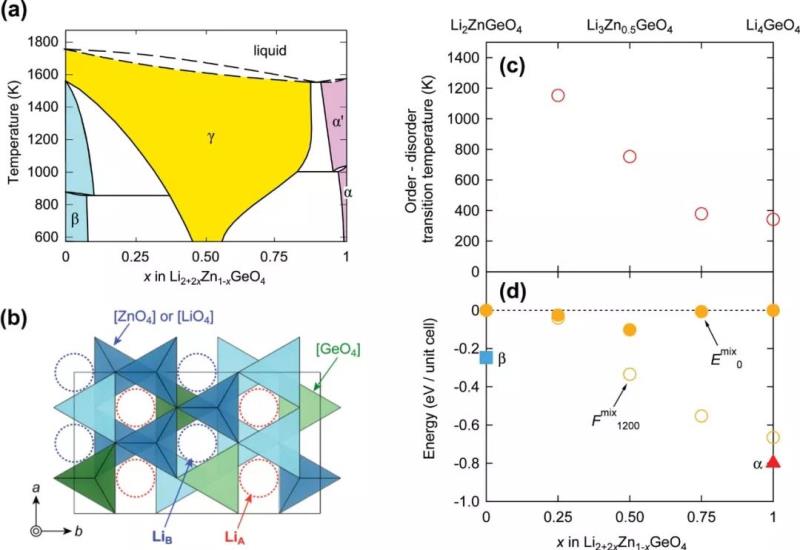 1978年,Henry Y.P. Hong提出同樣具有三維離子通道的LISICON(Li SuperIonic CONductor) 結(jié)構(gòu),Li14Zn(GeO4)4,并可擴(kuò)展為γ-Li3PO4體系(xLi4MIVO4—(1-x)Li3MVO4;MIV= Ge, Ti ;MV=As ,V) , 該體系僅在有限的濃度 (x=0.4~0.6)和溫度范圍內(nèi)可以形成固溶體純相。第一性原理方法主要用于計算周期性結(jié)構(gòu),對于該固溶體體系通常需要擴(kuò)展晶胞以滿足計量比要求,且該體系鋰離子擴(kuò)散過程中復(fù)雜的化學(xué)環(huán)境和多種輸運機(jī)制給計算帶來很大的挑戰(zhàn)。