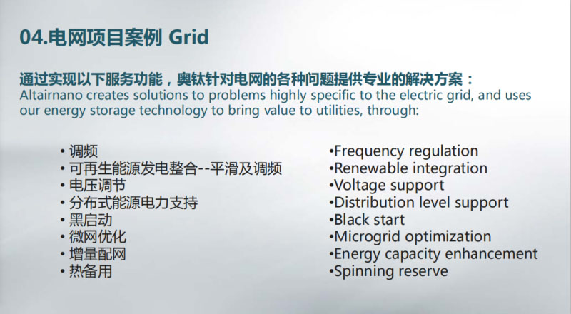 很快看一下整個產(chǎn)品系列。從納米鈦酸鋰材料到各個不同規(guī)格的軟包、方殼圓柱電芯以及應(yīng)用于不同模組的pack以及BMS管理單元到用于儲能的各種機柜以及集裝箱式的儲能產(chǎn)品到電機電控到純電動公交車。著重看一下奧鈦今年會投入市場的一款45尺集裝箱3MW/1MWh-1.2MWh。它的配置是3C倍率鈦酸鋰儲能系統(tǒng)。系統(tǒng)壽命是25年,用戶對它進行正常的我們要求的維護保養(yǎng)的基礎(chǔ)上,設(shè)計壽命是非常長的。還有,奧鈦的一個熱管理的技術(shù)能力,我們設(shè)計出了一款散熱性能以及空氣氣流非常均勻的一個散熱非常優(yōu)化的系統(tǒng),從pack到集裝箱。pack級別我們的溫差控制在了一攝氏度以內(nèi)。13米多的集裝箱溫差控制在了5攝氏度以內(nèi)。這對我們鈦酸鋰的優(yōu)勢的長期保障也提供了一個基礎(chǔ),就是熱管理的設(shè)計。這款產(chǎn)品我們將會應(yīng)用于國正在爆發(fā)的火電聯(lián)合調(diào)頻應(yīng)用以及國際市場的一些可再生能源平滑并網(wǎng)的運用。