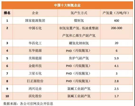 同時(shí),在化工工業(yè)副產(chǎn)氫方面,無論是焦?fàn)t氣副產(chǎn)氫氣、氯堿工業(yè)副產(chǎn)氫氣還是丙烷脫氫副產(chǎn)氫氣,涉及到的企業(yè)更是多達(dá)百家,因此本文中的中國十大制氫企業(yè),在設(shè)定標(biāo)準(zhǔn)時(shí),需同時(shí)滿足本身有穩(wěn)定的氫氣產(chǎn)能和已布局(或?qū)⒁季郑淙剂想姵禺a(chǎn)業(yè)兩個條件,排名順序根據(jù)企業(yè)的制氫量為標(biāo)準(zhǔn)。下表為中國十大制氫企業(yè)(按照制氫量進(jìn)行排名)。