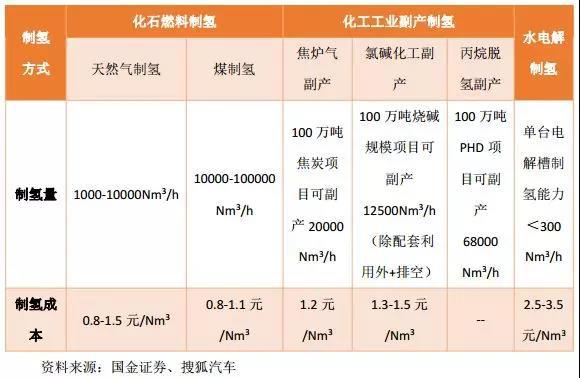 因此未來短時(shí)間內(nèi)我國氫能產(chǎn)業(yè)發(fā)展的氫源主要將來自化石燃料制氫(煤制氫)和化工工業(yè)副產(chǎn)氫(焦?fàn)t氣副產(chǎn)氫、氯堿副產(chǎn)、PDH即丙烷脫氫副產(chǎn)等)。下表為各種制氫方式的制氫規(guī)模以及成本。