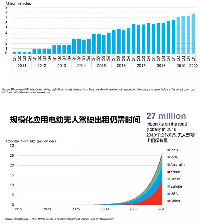 BNEF預(yù)計(jì)自動(dòng)駕駛要到2030年左右才會(huì)對(duì)全球交通和能源形態(tài)產(chǎn)生影響。預(yù)計(jì)到2040年,全球電動(dòng)無(wú)人駕駛出租保有量將達(dá)到2700萬(wàn)輛。