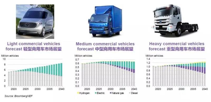 重型卡車是最難以電動(dòng)化的車型,其電動(dòng)車銷售占比在2040年僅為19%。電動(dòng)重卡將主要用于短途場(chǎng)景。但是,傳統(tǒng)的重型長(zhǎng)途卡車仍將面臨來(lái)自天然氣重卡和氫燃料電池重卡的競(jìng)爭(zhēng)。