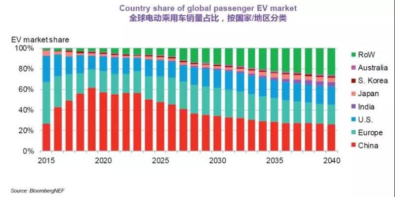 中國(guó)將繼續(xù)引領(lǐng)全球電動(dòng)車市場(chǎng)。BNEF預(yù)計(jì)2025年中國(guó)將占全球電動(dòng)乘用車銷量的48%。到2040年由于其他市場(chǎng)的快速追趕,中國(guó)銷量占比將降至26%。