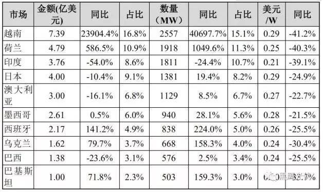 從出口市場看,我國組件出口前五位市場分別是越南、荷蘭、印度、日本和澳大利亞。其中越南取代印度成為我國組件出口第一大市場,對越南的組件出口額為 7.39 億美元,占總出口額的 16.8%,出口金額同比大幅提高 23904.4%;對印度組件出口數(shù)量為 1.81GW,同比大幅下降 24.4%;對日本出口數(shù)量小幅增長8.2%,對美國出口大幅減少 28.9%,對荷蘭、墨西哥、西班牙、烏克蘭和巴基斯坦等歐盟、拉美和中東地區(qū)出口同比大幅增長。