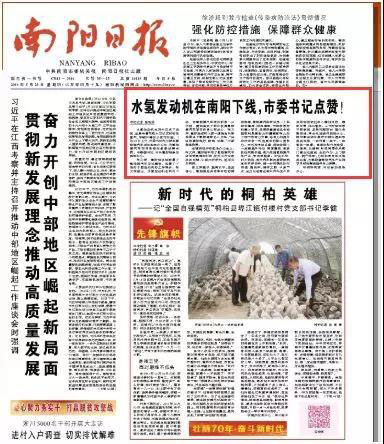 5月23日,南陽日報頭版發(fā)文《水制氫發(fā)動機正式下線,市委書記點贊!》,文章稱,水制氫發(fā)動機在我市正式下線了,這意味著車載水可以實時制取氫氣,車輛只需加水即可行駛。