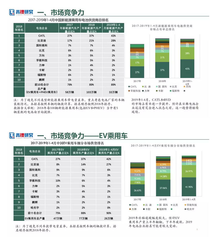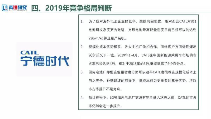 規(guī)模化成本優(yōu)勢釋放,各大主機(jī)廠爭相合作,海外客戶方面近期爆出沃爾沃又下一城。2019年1-4月,CATL在中國新能源乘用車市場的市占率已經(jīng)達(dá)到43%,相對于2018年的37%,繼續(xù)提高了6個百分點。