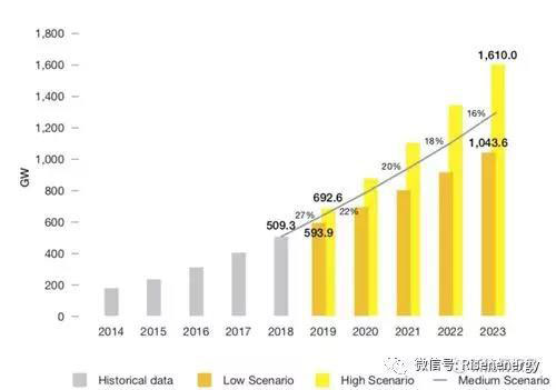 根據(jù)SolarPower Europe發(fā)布的《2019-2023年全球市場展望》,預(yù)計(jì)未來5年全球光伏新增裝機(jī)約800GW,即到2023年累計(jì)裝機(jī)將達(dá)到1.3TW。