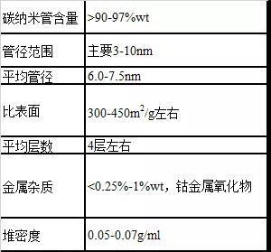 第六代碳納米管,金屬含量為鈷,含量小于0.25%-1%wt。對(duì)比俄羅斯某公司單層碳納米管,其金屬含量為15%,而且是鐵金屬。