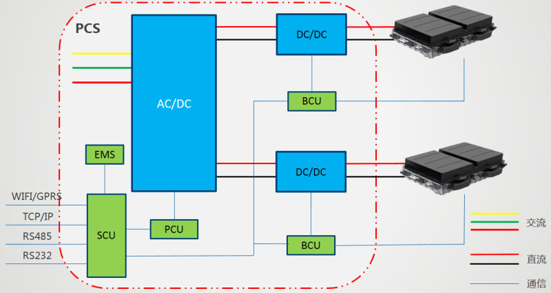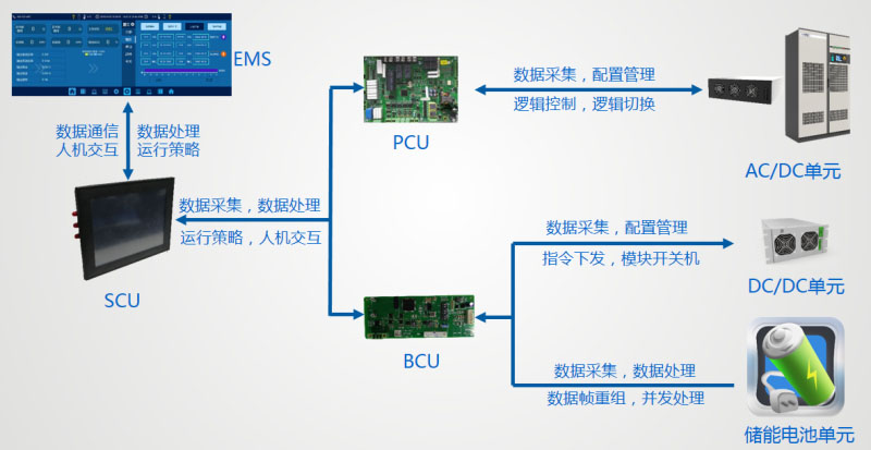 儲能電池種類繁多,對系統(tǒng)的安全穩(wěn)定性提出了重大考驗;儲能系統(tǒng)智能安全穩(wěn)定控制技術,采用分層管理、分層保護、分層控制的思想,集成BCU、PCU、SCU及EMS管理系統(tǒng)。BCU對電池包及DC/DC單元進行數(shù)據(jù)采集及數(shù)據(jù)處理,實現(xiàn)電池CAN數(shù)據(jù)幀重組保證40個電池包數(shù)據(jù)的并發(fā)處理以及系統(tǒng)指令下發(fā);PCU采集AC/DC單元數(shù)據(jù)上報到SCU,根據(jù)SCU指令進行邏輯控制,同時實現(xiàn)配置、告警及故障管理等;SCU與電池、電表、PCU、BCU、消防、EMS等通信,收集系統(tǒng)各部件數(shù)據(jù),實現(xiàn)數(shù)據(jù)處理、運行策略、人機交互等功能;EMS通過與SCU的TCP/IP通信獲取系統(tǒng)的所有數(shù)據(jù),提供人機交互、數(shù)據(jù)處理、運行策略及視頻監(jiān)控等其他服務,與第三方平臺通信,方便運維,確保了儲能系統(tǒng)的智能安全穩(wěn)定運行。