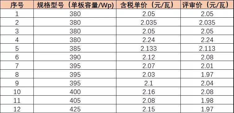 那么從評(píng)審價(jià)來(lái)看,380Wp高效組件最低報(bào)價(jià)為1.97元/瓦,最高2.24元/瓦,均價(jià)約2.05元/瓦,主要報(bào)價(jià)集中在2.0-2.1元/瓦。需要強(qiáng)調(diào)的是,標(biāo)書(shū)中對(duì)標(biāo)段一設(shè)定了招標(biāo)控制價(jià):以單板容量380Wp為基礎(chǔ)設(shè)最高投標(biāo)限價(jià)(P1=2.08元/Wp),如投標(biāo)方案單板容量(R)高于380Wp的,按公式Pn=P1+0.02*(R-380)/5調(diào)整相應(yīng)的最高投標(biāo)限價(jià)。