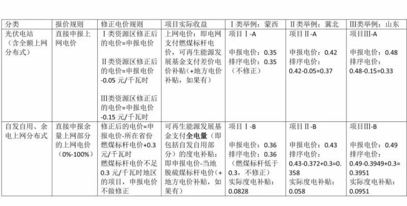 對地面電站和全額上網(wǎng)工商業(yè)分布式項目,一類資源區(qū)按申報電價,二類資源區(qū)按申報電價-0.05元/千瓦時修正,三類資源區(qū)按申報電價-0.15元/千瓦時修正。