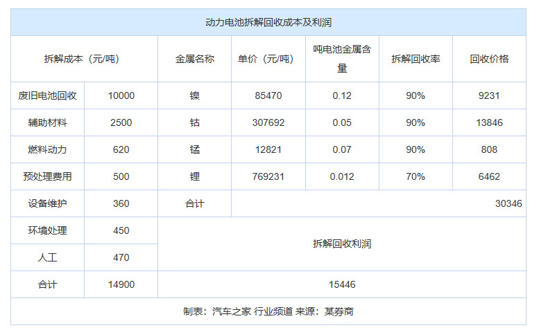 對(duì)于新能源汽車來說,電池達(dá)到報(bào)廢條件之后,要么你的車直接被回收,要么你的舊電池被回收。目前還看不到這樣淘汰下來的廢舊電池值多少錢,但多家券商給電池回收企業(yè)計(jì)算成本時(shí),使用的是10000元/噸的成本數(shù)。
