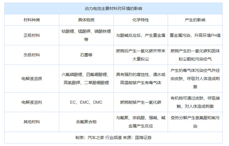但這種無污染,當(dāng)然還是相對(duì)而言。奇奇怪怪的各種化學(xué)材料扔到到自然環(huán)境中,降解很難,而且產(chǎn)生其他物質(zhì),對(duì)環(huán)境的危害仍然不小。尤其當(dāng)電池被整塊丟棄的時(shí)候,即使不考慮內(nèi)部物質(zhì)的危害。隨著電動(dòng)車逐步增多,這些電池大磚頭所形成的固體廢物也足夠令人頭疼。下表展示了包括磷酸鐵鋰和三元鋰在內(nèi)的各類電池對(duì)環(huán)境可能帶來的影響。由此可見,動(dòng)力電池材料的環(huán)境影響不小,治理回收仍然是個(gè)很棘手的問題。
