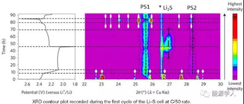 OperandoX射線衍射(XRD)是跟蹤晶體材料結(jié)構(gòu)變化的一種選擇技術(shù),在Li-S電池中,有四種可能的固相,即硫的α-和β-多晶型,放電產(chǎn)物L(fēng)i2S和Li2S2相,可以通過XRD觀察到。雖然硫正極的概念從20世紀(jì)70年代初就已經(jīng)知道了,但直到最近才發(fā)現(xiàn),首次循環(huán)之后,硫不會回到其α-多晶型,而是以β-型存在。同樣,近期人們才更多地關(guān)注鋰-硫電池放電產(chǎn)物的研究,Li2S產(chǎn)物在在低電位區(qū)域生成。至于Li2S2相,迄今為止,在標(biāo)準(zhǔn)電化學(xué)條件下還沒有用XRD進(jìn)行鑒定。幾個(gè)研究小組報(bào)告說,由于這一階段的高度不穩(wěn)定性,無法檢測到;也有報(bào)告稱Li2S2可能是高度無序的相,無法通過XRD進(jìn)行鑒定;其他研究人員認(rèn)為,Li2S2的壽命太短,任何技術(shù)都無法檢測到。直到最近,Paolella等人利用“鹽中溶劑”方法提出了Li2S2相的XRD特征,盡管其結(jié)果與大多數(shù)理論預(yù)測的空間群和晶體結(jié)構(gòu)相矛盾。