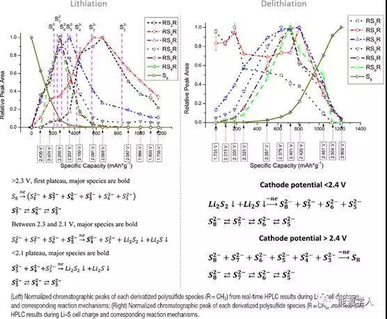 由于鋰-硫體系中的大多數(shù)反應(yīng)都發(fā)生在液相,因此在電池循環(huán)時(shí)能夠跟蹤鋰多硫化物(Li2Sn)至關(guān)重要。在這方面,Dominko和他的同事們已經(jīng)做了大量的工作,他們將Operando紫外-可見光譜技術(shù)作為追蹤和理解中間Li2Sn物態(tài)變化的可靠工具。近年來,X射線吸收近邊緣結(jié)構(gòu)研究已經(jīng)邁出了一步,使人們能夠研究重復(fù)充放電循環(huán)中硫物質(zhì)氧化狀態(tài)的演變。但這項(xiàng)技術(shù)需要同步輻射源,而且多硫化物的亞穩(wěn)態(tài)特性使得對參考樣品的測量變得困難,這對分析和結(jié)果產(chǎn)生了影響。當(dāng)需要選擇表征技術(shù)時(shí),多硫化物的介穩(wěn)性常常受到質(zhì)疑,這就解釋了高效液相色譜法(HPLC)用于分析衍生穩(wěn)定的溶解性多硫化物的原因。因此,提出了詳細(xì)的反應(yīng)機(jī)理,并闡明了每種中間體的作用(圖3)。本研究確認(rèn)了先前報(bào)告的結(jié)論,并提供了一個(gè)更加全面的表述。結(jié)果表明,高鋰化電位平臺主要?dú)w因于長鏈多硫化物,S82–、S72–、S62–之間存在一個(gè)元平衡,中鏈Li2Sn(S52–、S42之間的平衡)的電壓降對應(yīng)于長鏈的還原,低電位平臺是Li2S生成前短鏈Li2Sn(S42-和S32-之間的平衡)之間的平衡。在脫鋰過程,由于S82-、S72-、S62-和S52之間的動(dòng)態(tài)化學(xué)平衡(圖3),結(jié)果不太明顯。Saqib等人基于Operando紅外光譜的得出了類似的結(jié)論。此外,他們還發(fā)現(xiàn),聚硫化合物缺乏有序性、濃度的變化以及硫/Li2S復(fù)合困難是導(dǎo)致其長期循環(huán)性能不佳的原因。