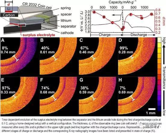 除了X射線衍射(XRD)外,透射電子顯微鏡(TEM)也經(jīng)常被用來研究鋰-硫電池在循環(huán)過程中形成的固體產(chǎn)物。但由于進(jìn)行這些測試所需的高真空條件會引起電解質(zhì)蒸發(fā),故大部分結(jié)果都是從異位樣品獲得的。當(dāng)樣品在一定的松弛時(shí)間后被檢測時(shí),不能真實(shí)地反映電池暫停時(shí)的平衡,并被認(rèn)為與其中發(fā)生的動(dòng)態(tài)過程有關(guān)。然而,盡管存在這些障礙,一些研究小組仍試圖進(jìn)行原位或Operando TEM試驗(yàn),為S8和Li2S階段的結(jié)構(gòu)完整性以及循環(huán)期間發(fā)生的體積變化提供了見解。如前所述,由于高真空環(huán)境,循環(huán)條件與標(biāo)準(zhǔn)條件非常不同。為了在鋰-硫電池中實(shí)現(xiàn)“相位捕獲”,Yang等人電化學(xué)阻抗譜和X射線照相相結(jié)合。由于特殊的Operando裝置能夠同時(shí)滿足這兩種技術(shù)的要求,他們確定了鋰電極周圍的一個(gè)環(huán),其厚度隨電荷狀態(tài)(SOC)的變化而變化(圖2)。這一觀察結(jié)果與硫化學(xué)的變化直接相關(guān),因?yàn)樵诟唠娢缓偷碗娢黄脚_的末端分別達(dá)到了極限。