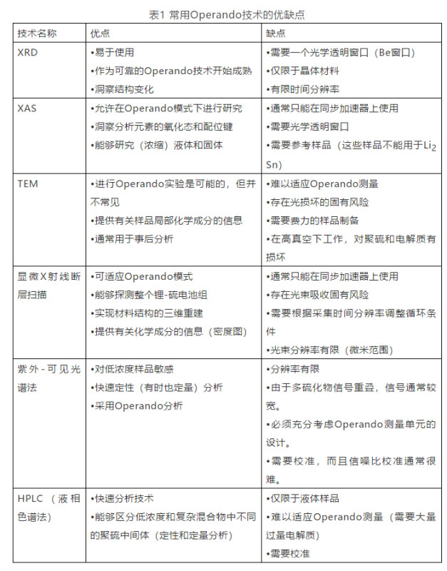 Operando技術(shù)可以回答與Li-S反應(yīng)機(jī)制有關(guān)的不同問題。表1總結(jié)了最常用的Operando技術(shù)的優(yōu)點(diǎn)和缺點(diǎn)。