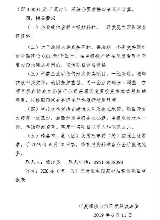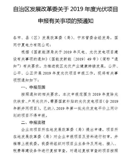 6月11日,寧夏自治區(qū)發(fā)改委發(fā)布《關(guān)于2019年度光伏項(xiàng)目申報(bào)有關(guān)事項(xiàng)的預(yù)通知》,要求各市、縣(區(qū))發(fā)展改革委(局)按照要求,于6月20日前,將有關(guān)資料準(zhǔn)備齊全后上報(bào)。