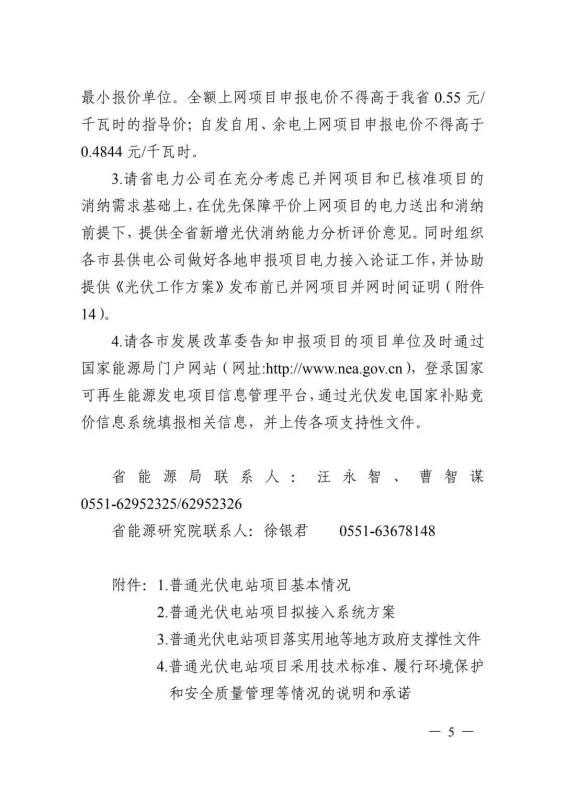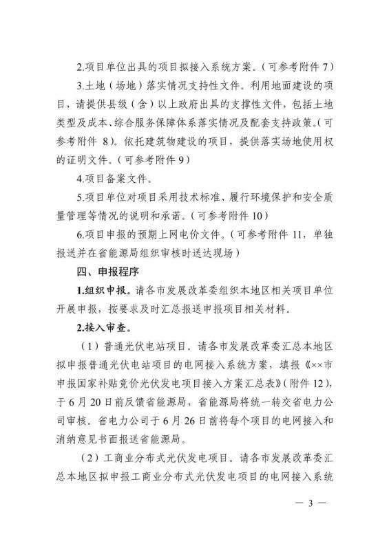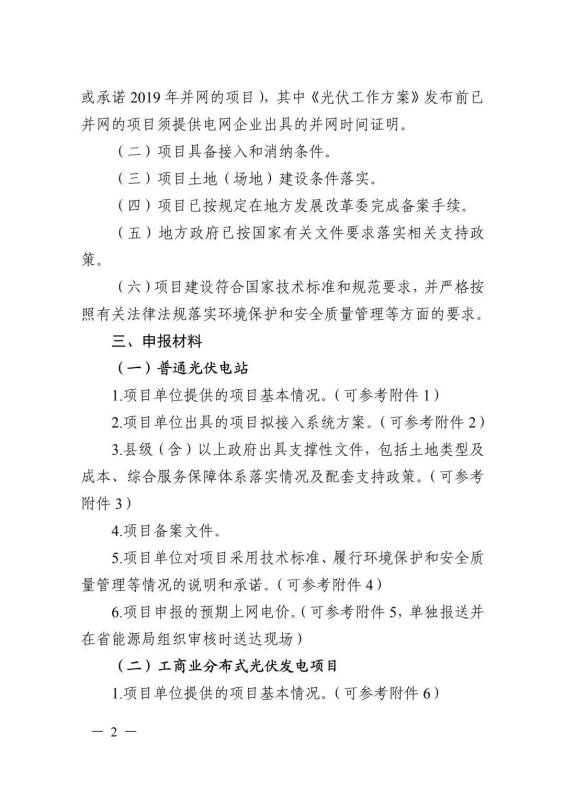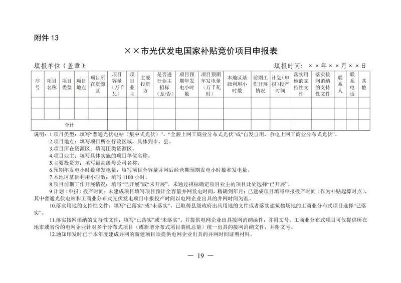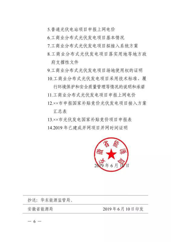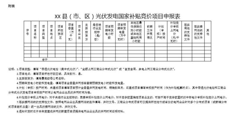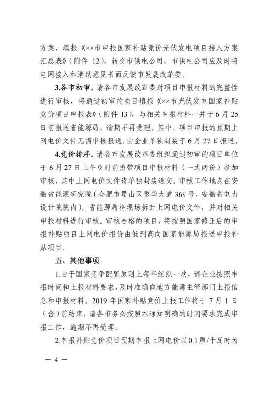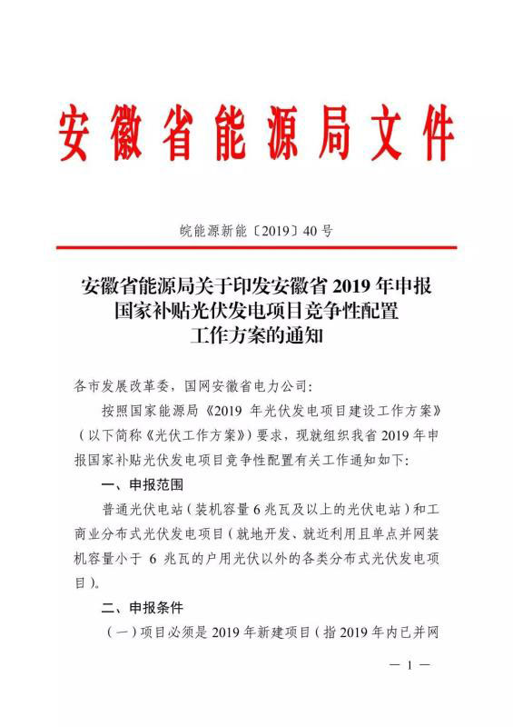 6月10日,安徽省能源局印發(fā)《關(guān)于2019年申報(bào)國(guó)家補(bǔ)貼光伏發(fā)電項(xiàng)目競(jìng)爭(zhēng)性配置工作方案的通知》,要求于6月20日前反饋至省能源局。申報(bào)要求必須是2019年新建項(xiàng)目,已并網(wǎng)的需提供電網(wǎng)企業(yè)出具的并網(wǎng)時(shí)間證明,另外還需具備接入和消納條件、土地建設(shè)落實(shí)條件、完成備案手續(xù)等。