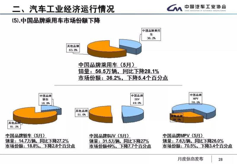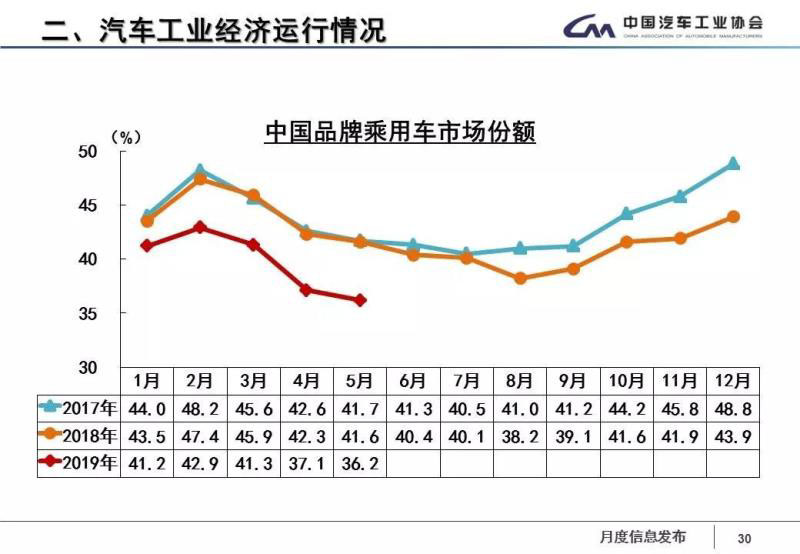 在今年4月份,中國(guó)品牌乘用車市場(chǎng)份額已經(jīng)降到2017年以來的最低值。到了5月份,中國(guó)品牌乘用車市場(chǎng)份額依舊在降低。