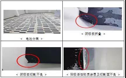 (解體、分析)多數(shù)的事故可以確定為是由于使用了同一工廠相似時(shí)期內(nèi)生產(chǎn)的電池。因此,為確認(rèn)電池生產(chǎn)過(guò)程中的缺陷,對(duì)電池進(jìn)行了解體分析。結(jié)果表明,一家公司的一部分電池中存在極片折疊、切割不良、活性材料涂層不良等制造缺陷。