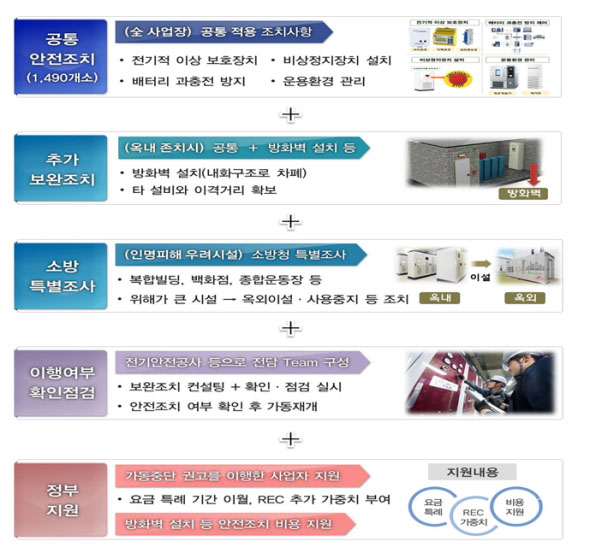 2018年5月份開始火災(zāi)事故頻頻發(fā)生,產(chǎn)業(yè)部在優(yōu)先考慮國民安全的前提下,采取了現(xiàn)場實時調(diào)查,安全診斷,ESS設(shè)備全面停止等多方位的相應(yīng)措施。