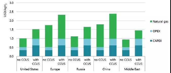 2018年不同區(qū)域使用天然氣生產(chǎn)氫氣的成本,詳見下圖: