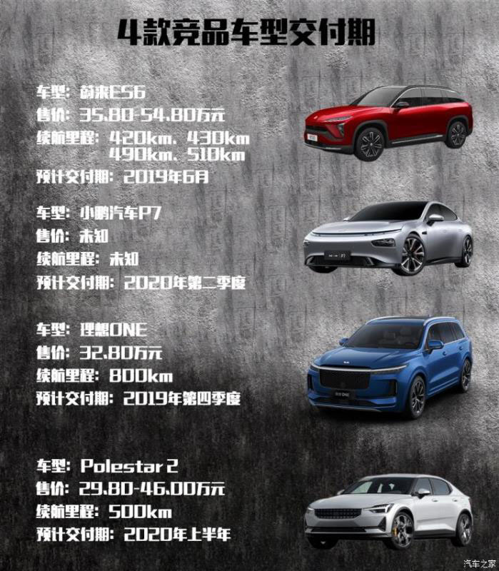 文章開頭我們提到,受到交付期的影響,國產(chǎn)版Model 3面臨的競爭對手鎖定在了6-10個月之后。而目前國內(nèi)市場處在30萬元級別左右的純電動車數(shù)量并不多,若根據(jù)其售價區(qū)間來劃分,目前也已經(jīng)占領(lǐng)該價位段的幾款待交付車型,或?qū)⒊蔀槠渥钪苯拥母偁帉κ?,例如蔚來ES6、小鵬汽車P7、理想ONE以及Polestar 2。