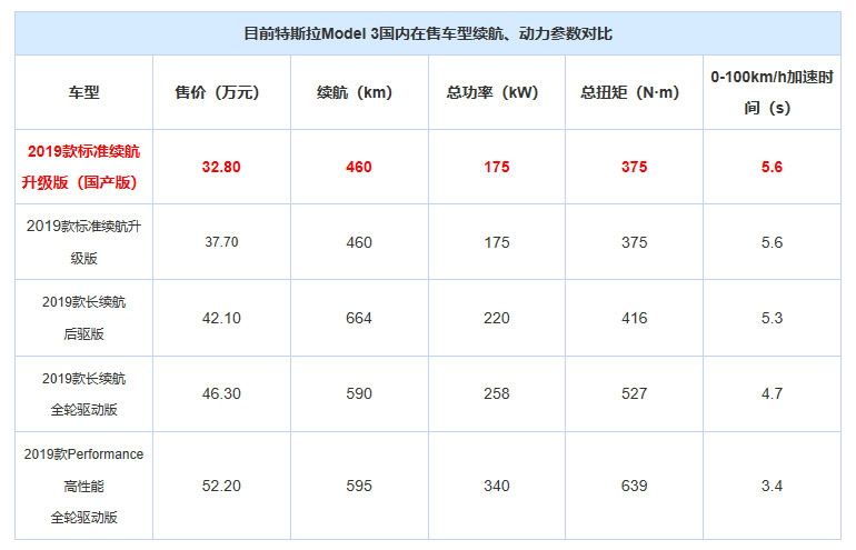 特斯拉Model 3自海外交付以來一直處于全球各地區(qū)的熱門車型,官方公布其2019年第一季度在全球交付了5.09萬輛,而對于中國市場而言,消費(fèi)者顯然更加關(guān)注國產(chǎn)化后的產(chǎn)品和價格。5月31日,特斯拉正式公布了國產(chǎn)版Model 3的售價,同時已開啟預(yù)售,此次國產(chǎn)Model 3僅有標(biāo)準(zhǔn)續(xù)航升級版一款車型,售價32.8萬元。該車型與進(jìn)口版標(biāo)準(zhǔn)續(xù)航升級版車型相比,兩車動力參數(shù)相同,續(xù)航里程也同樣為460km,而該進(jìn)口版車型售價為37.7萬元,兩者擁有4.9萬元的差價。