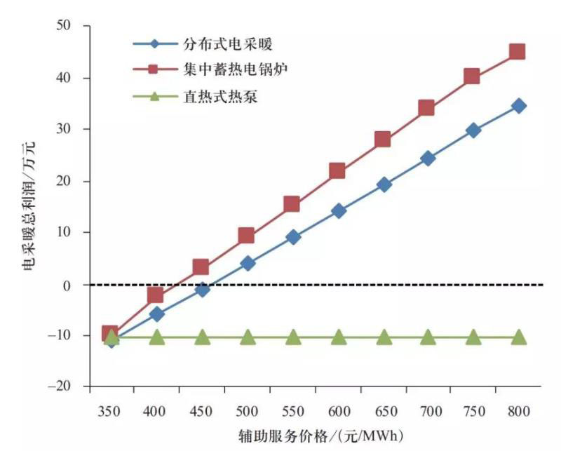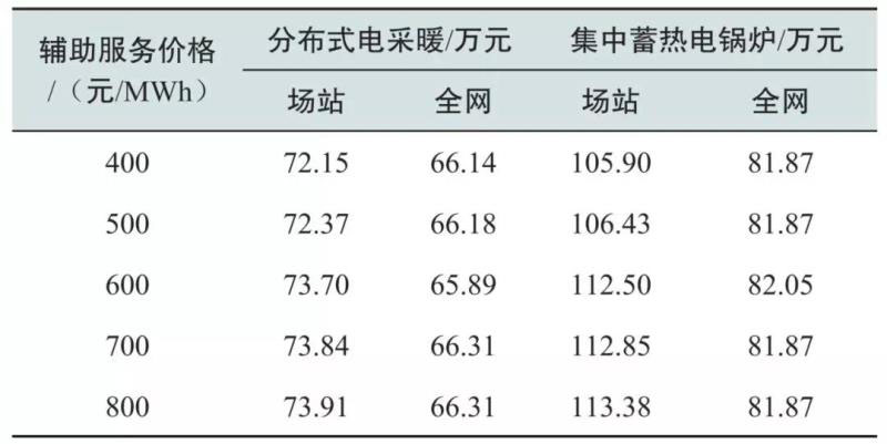 對于分布式電采暖和集中蓄熱式電采暖,其可行輔助服務(wù)價格分別為460.1和425.9元/MWh。根據(jù)東北電網(wǎng)火電機(jī)組深度調(diào)峰的出清價格規(guī)定,調(diào)峰價格根據(jù)調(diào)峰深度可以分為0~400元/MWh、400~600元/MWh、600~800元/MWh三檔,可見電采暖的可行價格與火電機(jī)組相比具有較大的競爭力。