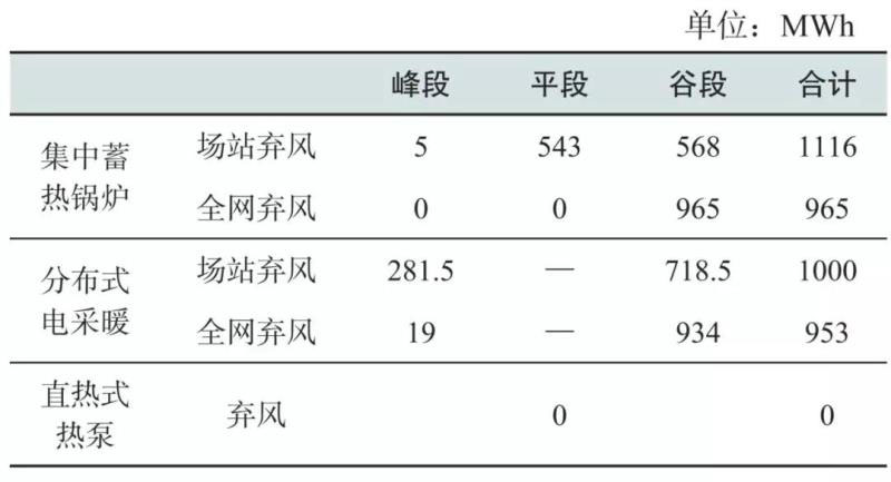 不論是集中式還是分布式電采暖,由于調(diào)節(jié)能力制約,其在棄風(fēng)水平較高的全網(wǎng)棄風(fēng)條件下,并沒有消納更多的棄風(fēng)。對比棄風(fēng)的消納時段,全網(wǎng)棄風(fēng)條件下,更多的棄風(fēng)電量集中在電價更低的谷段時間,而在場站棄風(fēng)條件下,在電價更高的平或峰時段消耗了大量棄風(fēng)。計算可得,集中蓄熱電鍋爐在場站和全網(wǎng)棄風(fēng)條件下谷段消納棄風(fēng)比例分別為50.9%和100%;分布式電采暖在風(fēng)電場和全網(wǎng)棄風(fēng)條件下谷段消納棄風(fēng)比例分別為71.9%和98%。