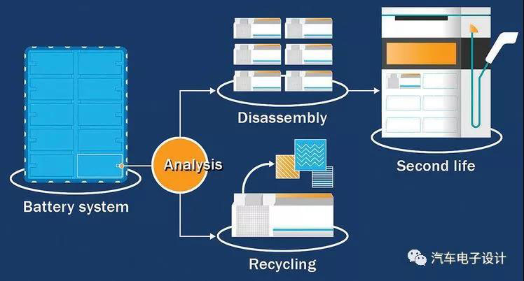 還有最重要的就是把進(jìn)入EOL生命周期的電池系統(tǒng)拆解回收,目前的回收率為53%。如下圖所示,整個(gè)分解過(guò)程主要分為前段和后段。
