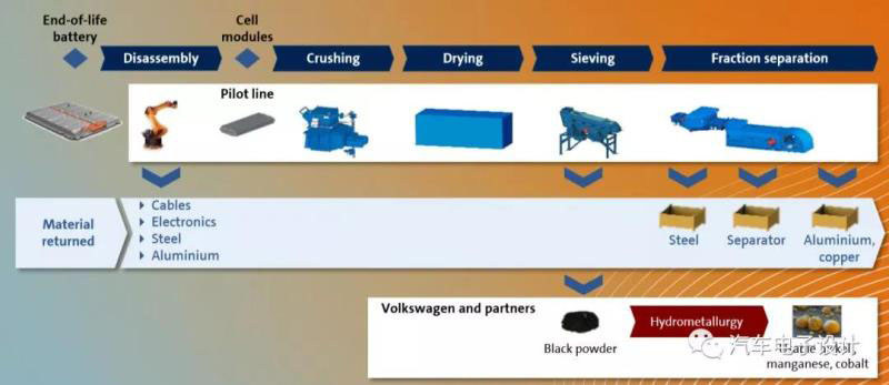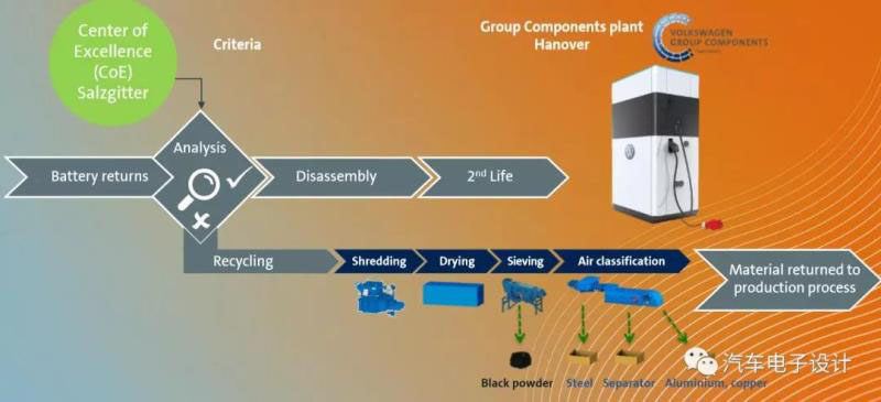 整個(gè)工藝過(guò)程如下圖所示,可以看到大眾考慮這件事情,是把模組作為最小的單元,模組以下就是統(tǒng)一機(jī)械化處理。所以這個(gè)模組整體是要能拆解的,而模組本身維修也好,后續(xù)分解也好作為一個(gè)整體。
